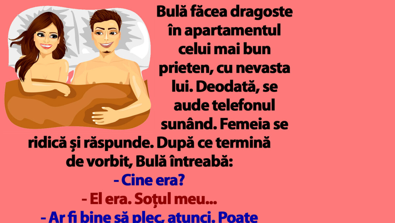 Bulă făcea dragoste în apartamentul celui mai bun prieten, cu nevasta lui. Deodată, se aude telefonul sunând. Femeia se ridică și răspunde. După ce termină de vorbit, Bulă întreabă: