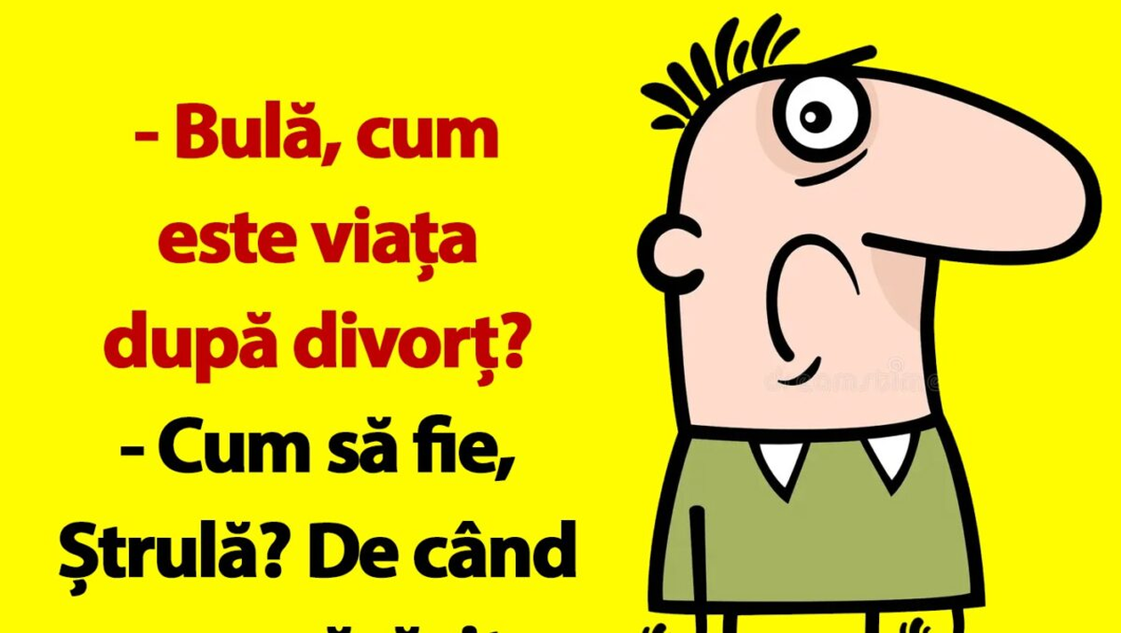 Ziua bună se cunoaște încă de dimineață, așa că trebuie începută cu zâmbetul pe buze. Iar pentru asta am pregătit un banc care cu siguranță te va amuza copios. Protagonistul de astăzi este Bulă, care numai ce a trecut printr-un divorț. Bulă se confesează prietenului său, iar deznodământul este hilar.