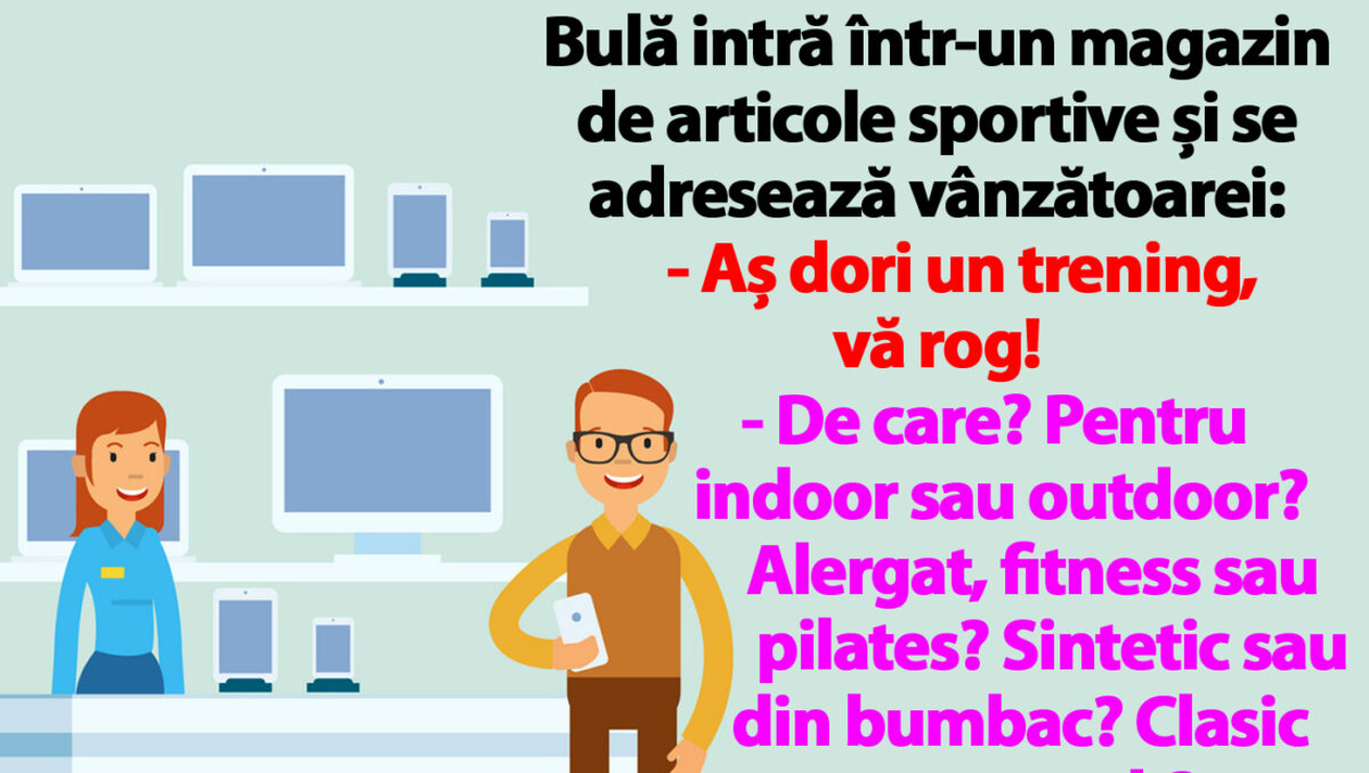 „Bulă intră într-un magazin de articole sportive și se adresează vânzătoarei: