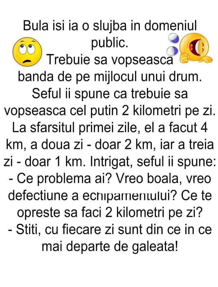 Bulă își ia o slujbă în domeniul public. Trebuia să vopsească banda de pe mijlocul unui drum de ţară. Şeful ei îi spune că se află în perioada de probă şi trebuie să vopsească cel puţin doi kilometri pe zi, dacă vrea să-şi păstreze serviciul. Verificând la sfârşitul zilei, el vede că în prima zi făcuse patru kilometri, dublu faţă de medie. A două zi a fost puţin dezamăgit, pentru că Bulă nu vopsise decât doi kilometru. Se gândeşte că oricum asta e media şi trece cu vederea. Dar a treia zi, când Bulă vopsise doar un kilometru, îi spune: