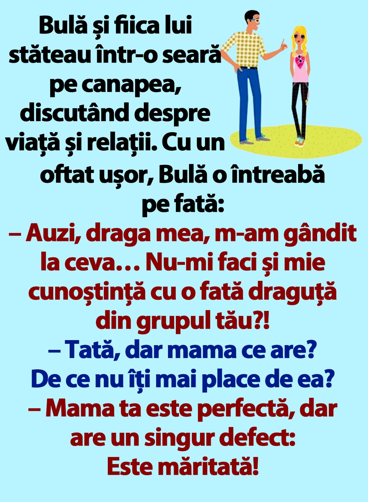 Bulă și fiica lui stăteau într-o seară pe canapea, discutând despre viață și relații. Cu un oftat ușor, Bulă o întreabă pe fată: