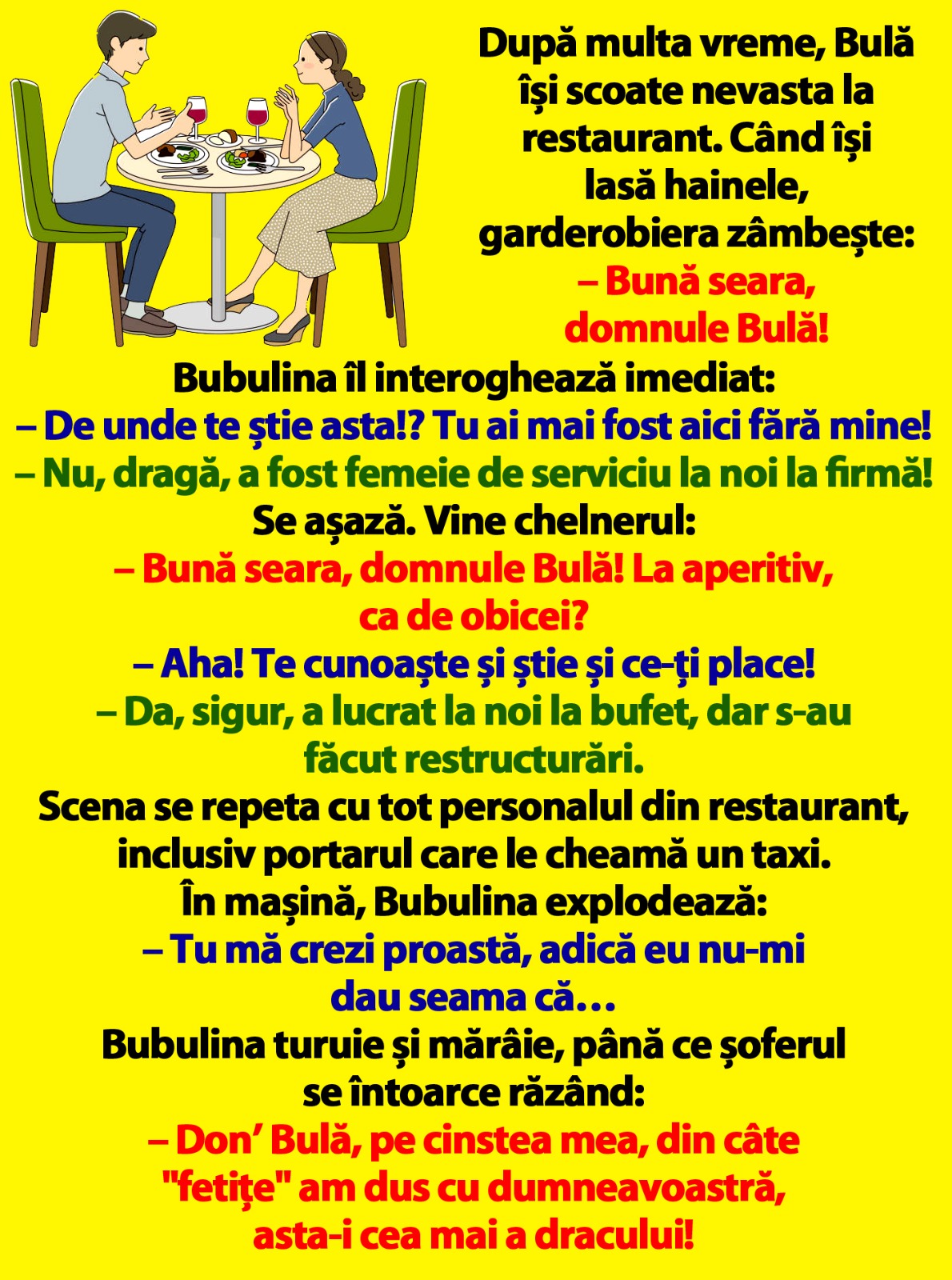 După multa vreme, Bulă își scoate nevasta la restaurant. Când își lasă hainele, garderobiera zâmbește: