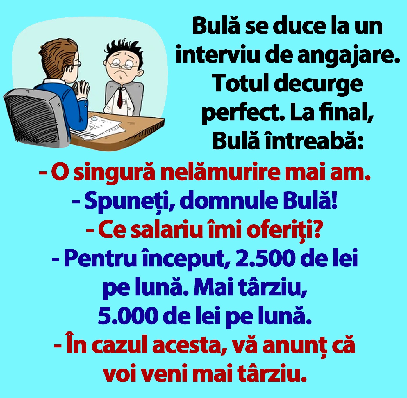 „Bulă se duce la un interviu de angajare. Totul decurge perfect. La final, Bulă întreabă: