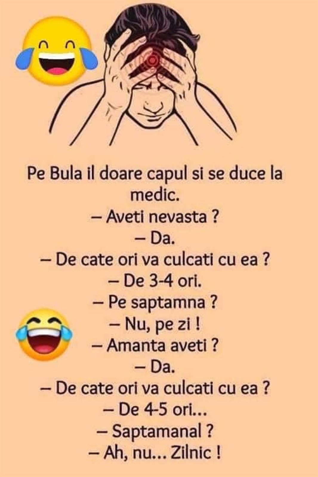 Dragi cititori, CANCAN.RO vă prezintă un nou banc de nota 10. Garantat veți râde cu lacrimi! Bulă se confruntă cu dureri de cap, motiv pentru care merge la un consult medical de specialitate.