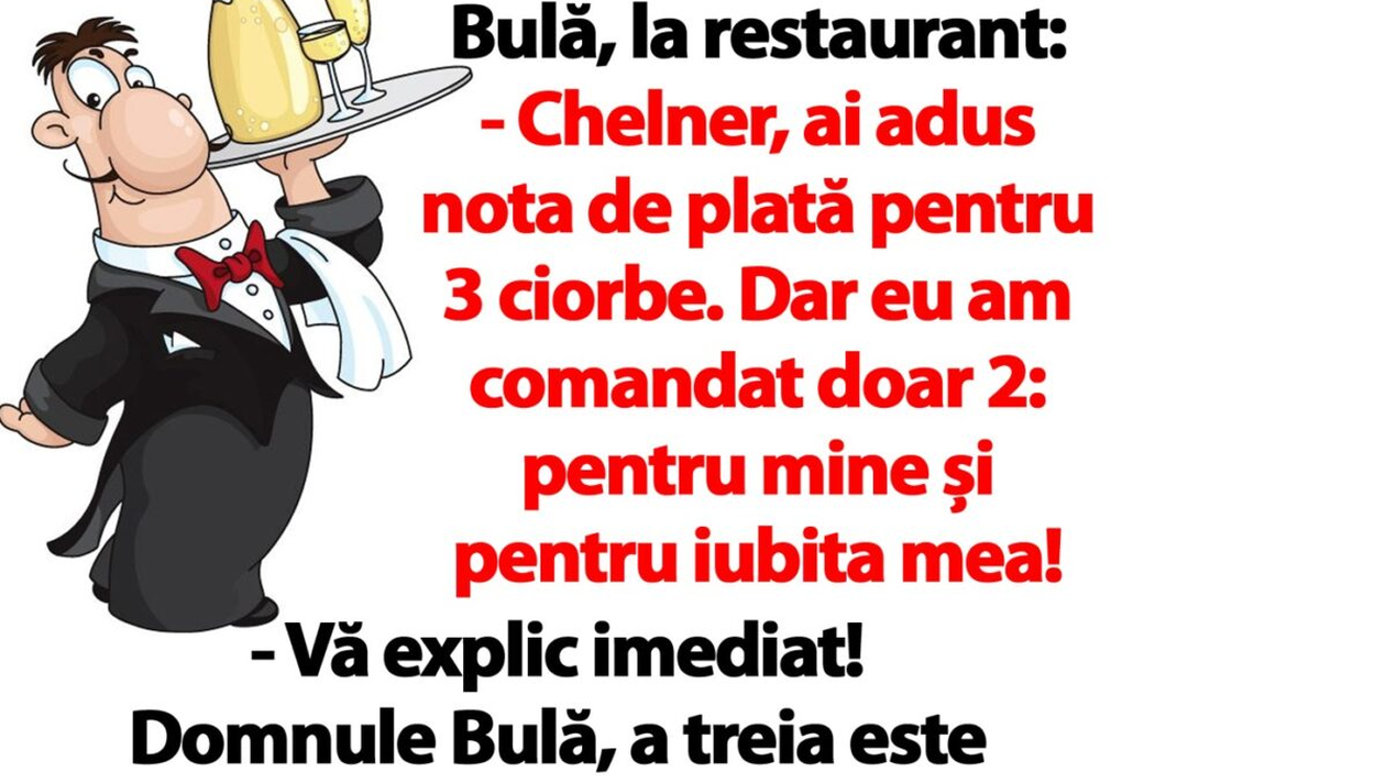 Pentru că ne apropiem cu pași mari de weekend, îți dăruim o glumă care să te pregătească pentru relaxare. Bancul de astăzi spune „povestea” lui Bulă care merge la restaurant și se trezește cu trei ciorbe pe nota de plată, deși mâncase doar două. Ce explicație îi va da chelnerul vă va stârni hohote de râs! (VEZI ȘI: BANC | Bulă agață o femeie. La avansurile lui, aceasta…)