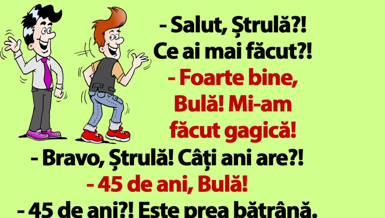 Ziua bună se cunoaște de dimineață, așa că trebuie să o începem cu zâmbetul pe buze. Iar pentru asta am pregătiti un banc care cu siguranță te va amuza copios. Protagoniștii de astăzi sunt Bulă și Ștrulă. Primul și-a făcut iubită, iar cel de-al doilea este foarte curios să afle cine este misterioasa cucerire. Deznodământul este hilar.