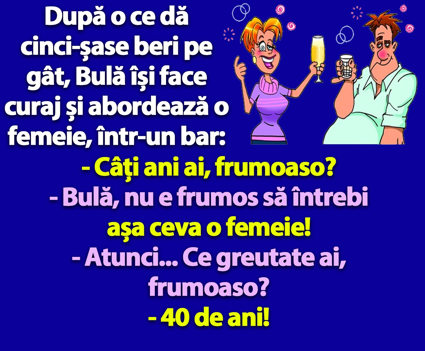 CANCAN.RO a pregătit cititorilor săi un moment de amuzament, care va face pe oricine să râdă în hohote, încă de la primele ore ale dimineții. Vă prezentăm un banc fabulos, ce va însenina ziua oricui. Iată cum decurge discuția dintre Bulă și o femeie, pe care încearcă s-o abordeze într-un bar.