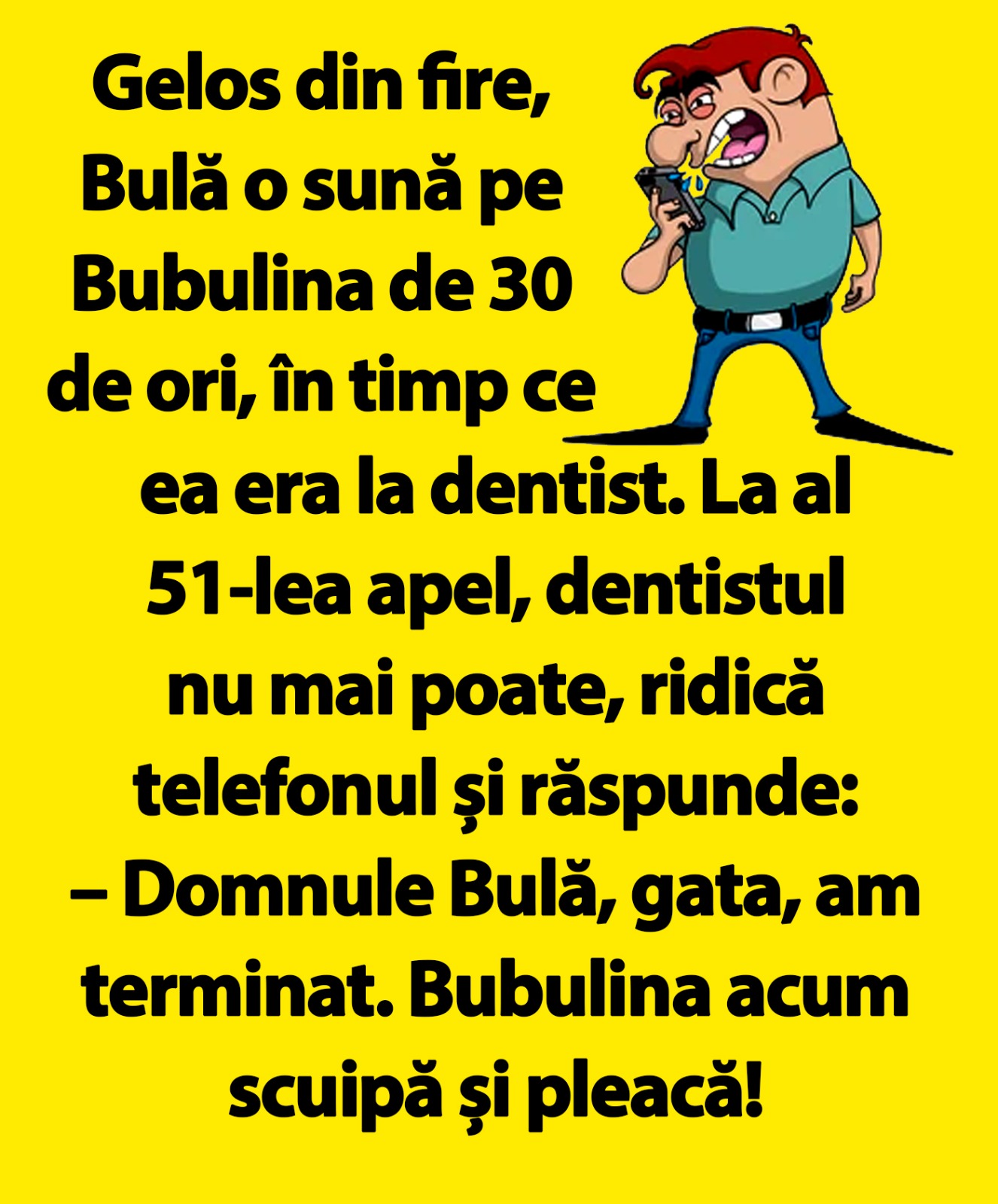 Gelos din fire, Bulă o sună pe Bubulina de 30 de ori, în timp ce ea era la dentist. La al 51-lea apel, dentistul nu mai poate, ridică telefonul și răspunde: