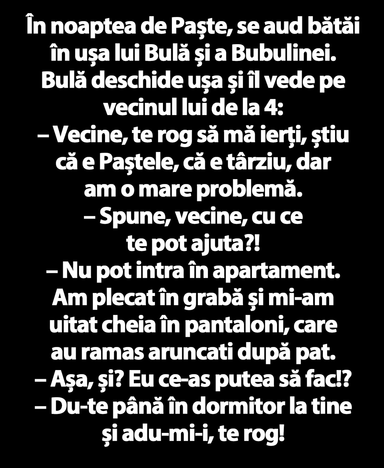 – Vecine, te rog să mă ierți, știu că e Paștele, că e târziu, dar am o mare problemă.