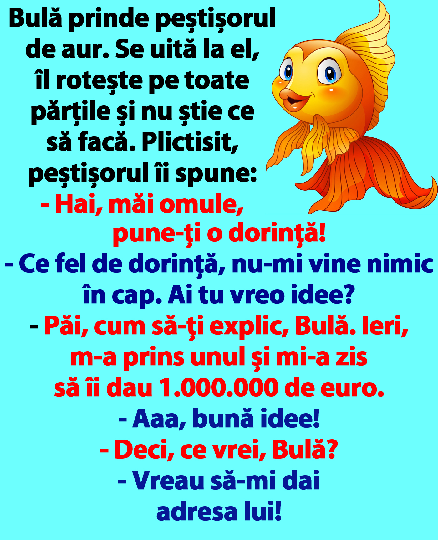 „Bulă prinde peștișorul de aur. Se uită la el, îl rotește pe toate părțile și nu știe ce să facă. Plictisit, peștișorul îi spune: