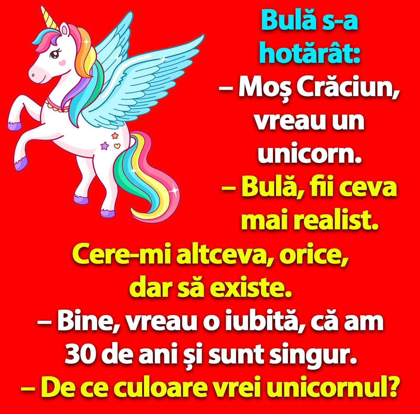– Moș Crăciun, vreau un unicorn.