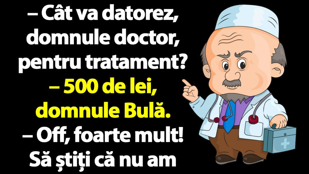 Dragi cititori, CANCAN.RO vă pune la dispoziție un banc amuzant, care vă va face ziua mai frumoasă instant. Iată discuția epică dintre Bulă și doctorul lui.