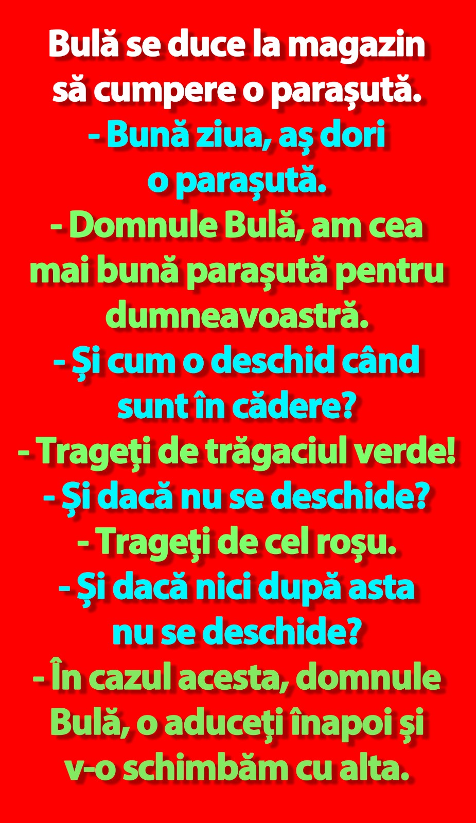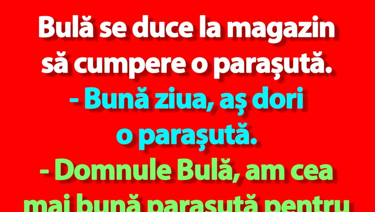 – Domnule Bulă, am cea mai bună parașută pentru dumneavoastră.