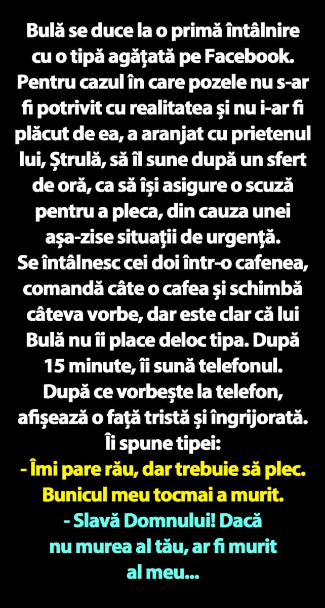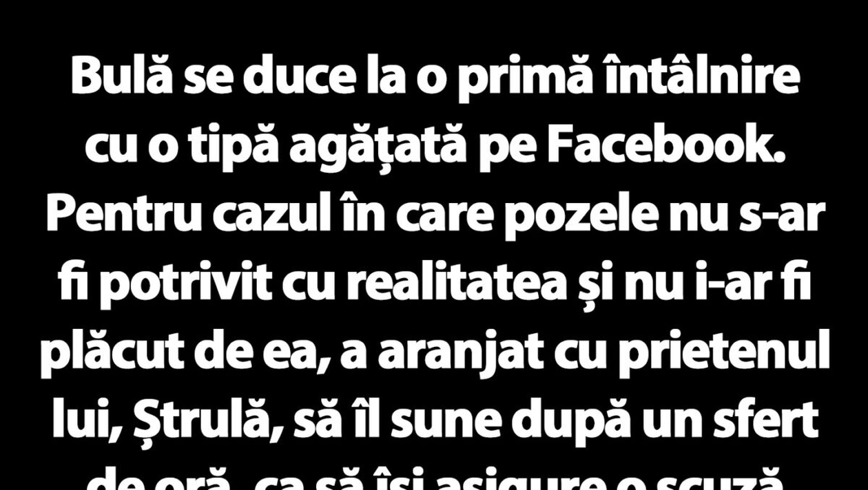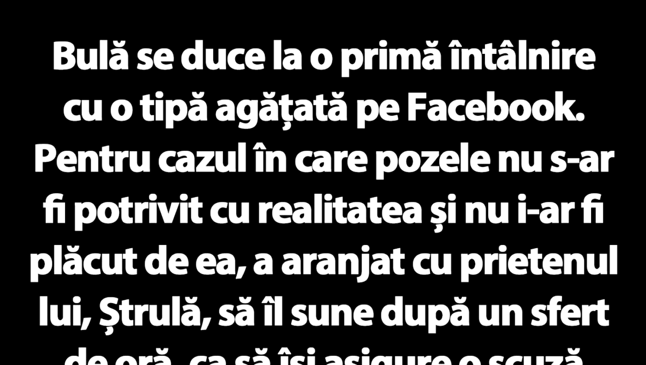 Bulă se duce la o primă întâlnire cu o tipă agățată pe Facebook. Pentru cazul în care pozele nu s-ar fi potrivit cu realitatea și nu i-ar fi plăcut de ea, a aranjat cu prietenul lui, Ștrulă, să îl sune după un sfert de oră, ca să își asigure o scuză pentru a pleca, din cauza unei așa-zise situații de urgență.