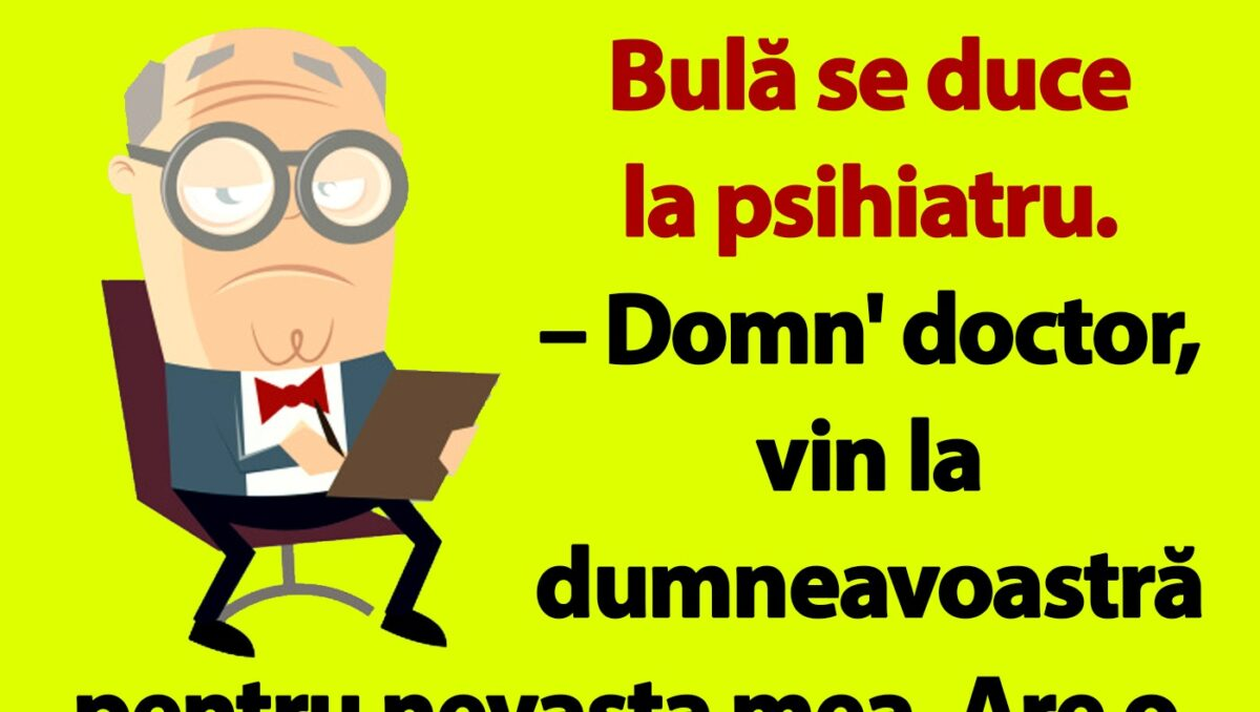 Ziua bună se cunoaște încă de dimineață, așa că trebuie începută cu zâmbetul pe buze. Iar pentru asta am pregătit un banc care cu siguranță o să te amuze copios. Protagonistul de astăzi este Bulă. Acesta merge la psihiatru pentru a cere ajutor pentru soția sa. Deznodământul este hilar.