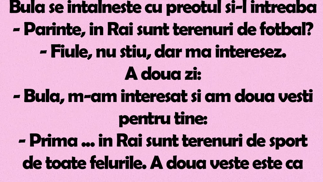 BANC | Bulă se întâlnește cu preotul și îl întreabă: Părinte, în Rai sunt terenuri de fotbal?