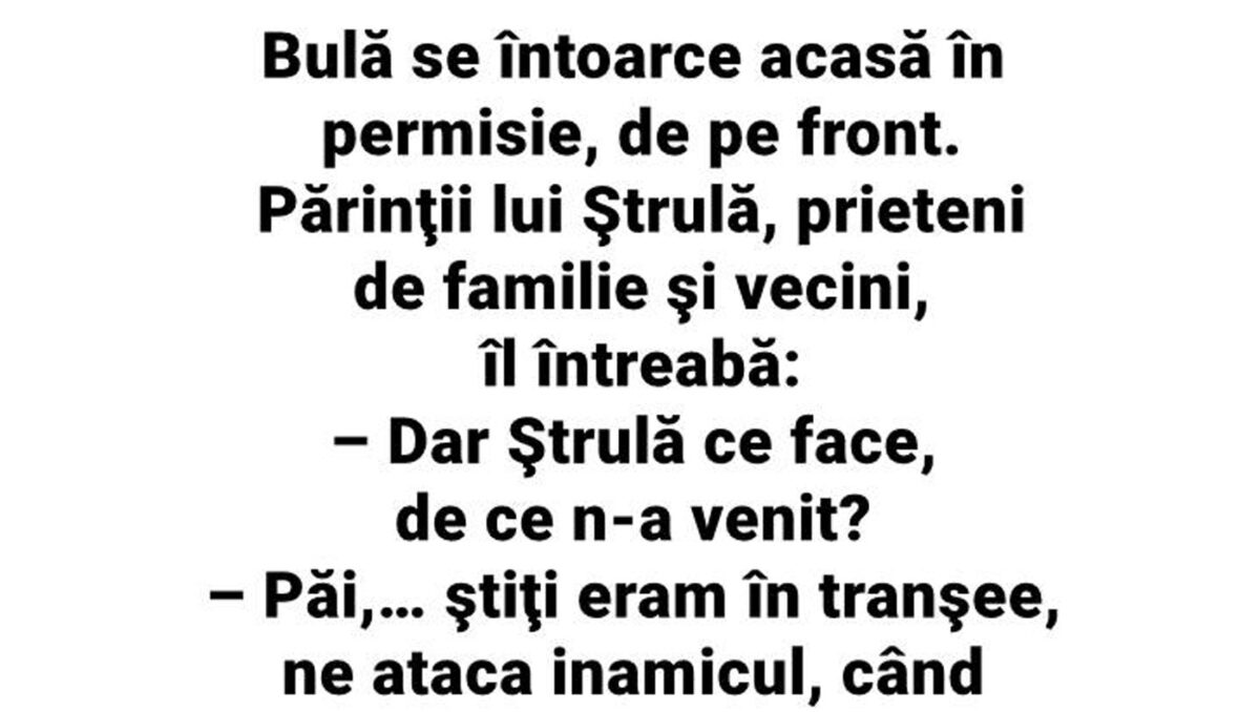 – Păi, știți, eram în tranșee, ne ataca inamicul, când ce-i trece lui Ștrulă prin cap!?
