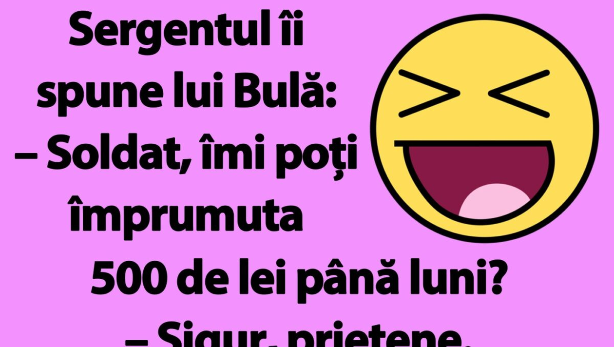 Ziua bună se cunoaște încă de dimineață, așa că trebuie începută cu zâmbetul pe buze. Iar pentru asta am pregătit un banc care cu siguranță te va amuza copios. Protagonistul de astăzi este Bulă. Acesta este în armată, iar un superior îi cere bani împrumut. Deznodământul este hilar.