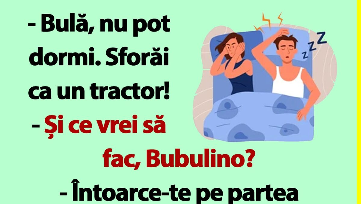 CANCAN.RO ți-a pregătit un banc de nota 10. Bubulina îl acuză pe Bulă că sforăie ca un tractor. În miez de noapte, cei doi au o discuție tare haioasă. Spor la râs și voie bună.
