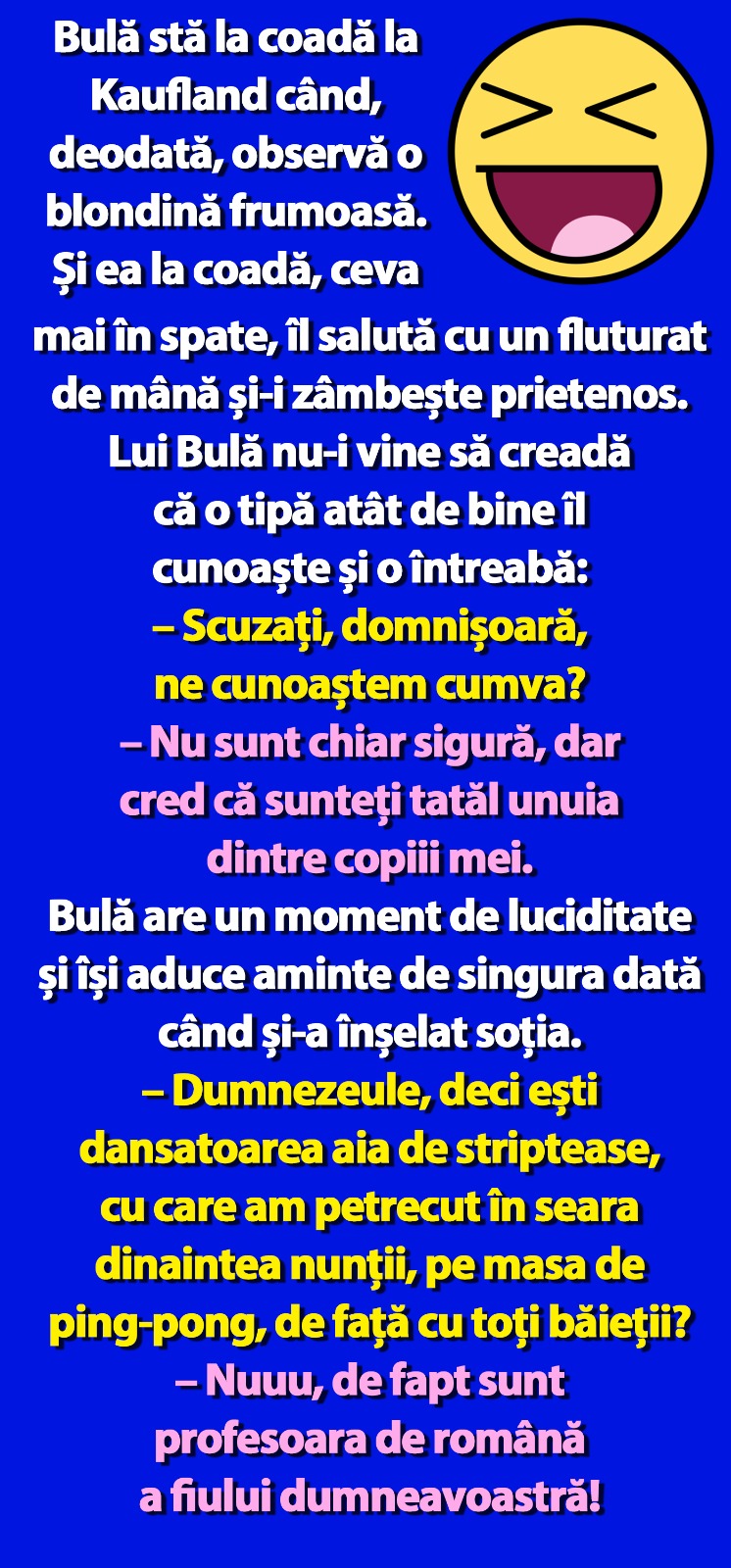 Ziua bună se cunoaște încă de dimineață, așa că trebuie începută cu zâmbetul pe buze. Iar pentru asta am pregătit un banc care cu siguranță te va amuza copios. Protagonistul de astăzi este Bulă, ce are o întâlnire cu o blondă în Kaufland. Deznodământul este hilar.