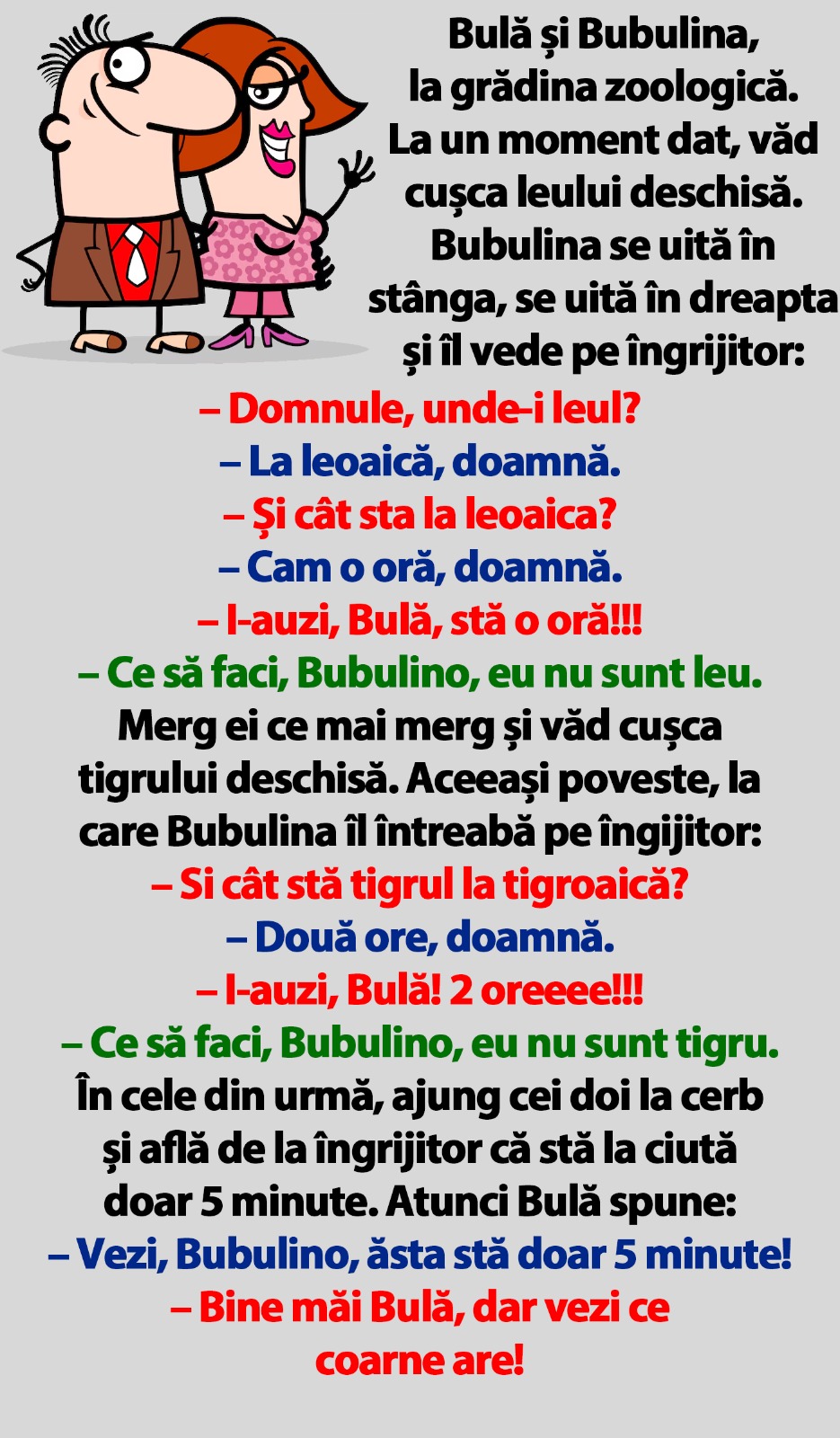 Bulă și Bubulina, la grădina zoologică. La un moment dat, văd cușca leului deschisă. Bubulina se uită în stânga, se uită în dreapta și îl vede pe îngrijitor: