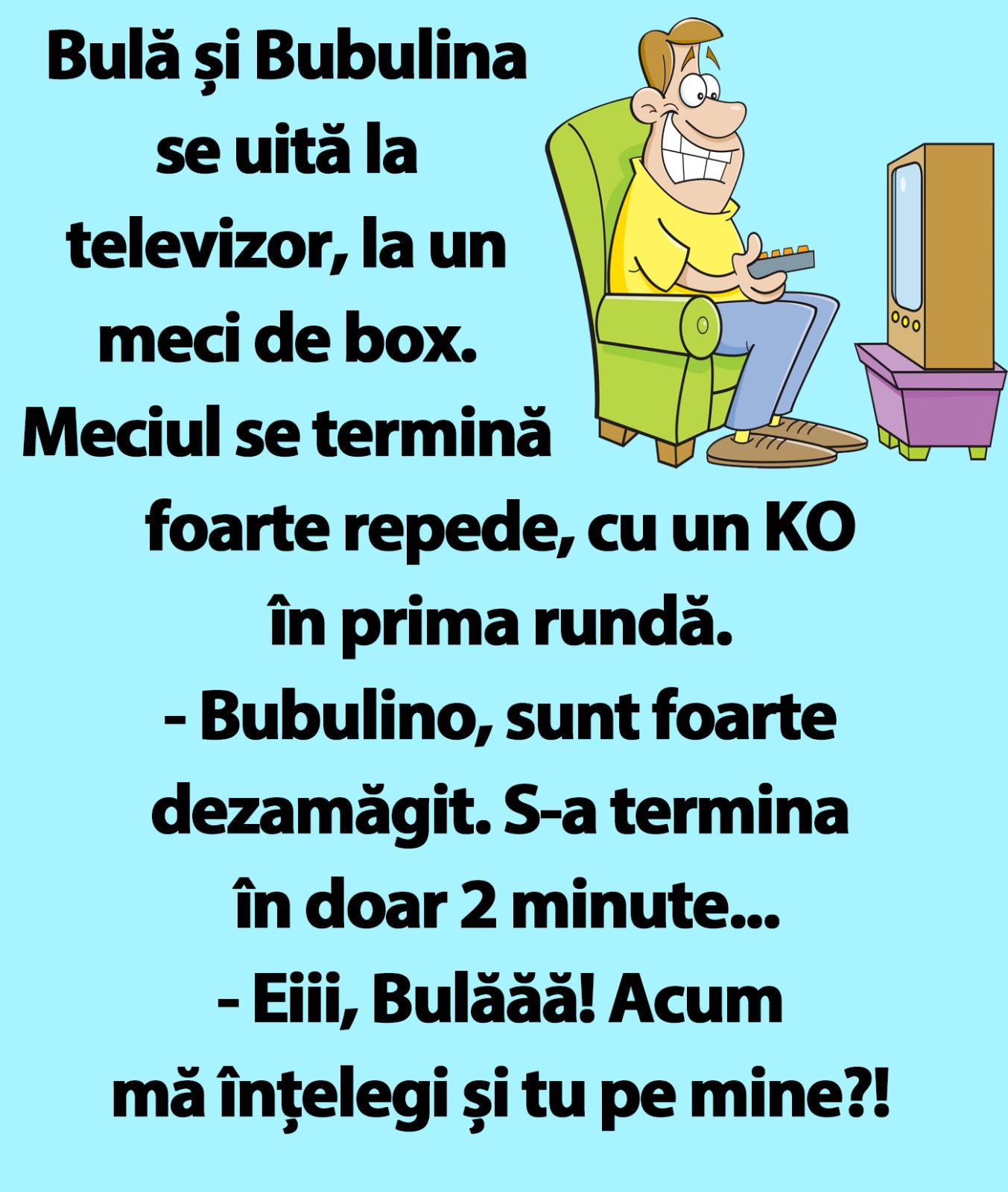 Bulă și Bubulina se uită la televizor, la un meci de box. Meciul se termină foarte repede, cu un KO în prima rundă.