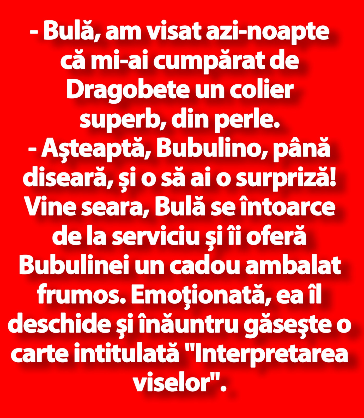 – Bulă, am visat azi-noapte că mi-ai cumpărat de Dragobete un colier superb, din perle.