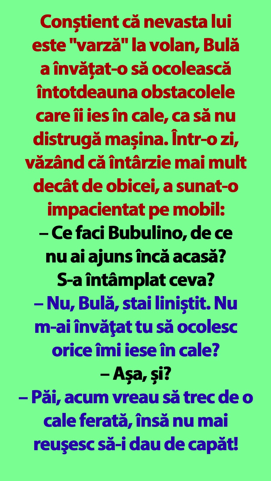 Conștient că nevasta lui este „varză” la volan, Bulă a învățat-o să ocolească întotdeauna obstacolele care îi ies în cale, ca să nu distrugă mașina. Într-o zi, văzând că întârzie mai mult decât de obicei, a sunat-o impacientat pe mobil: