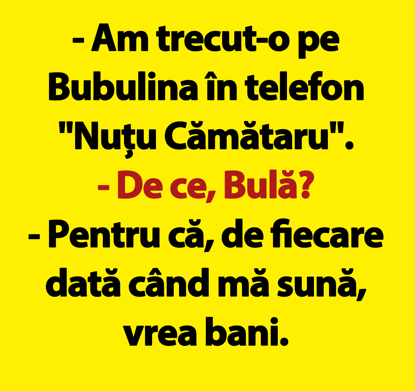 – Am trecut-o pe Bubulina în telefon „Nuțu Cămătaru”.