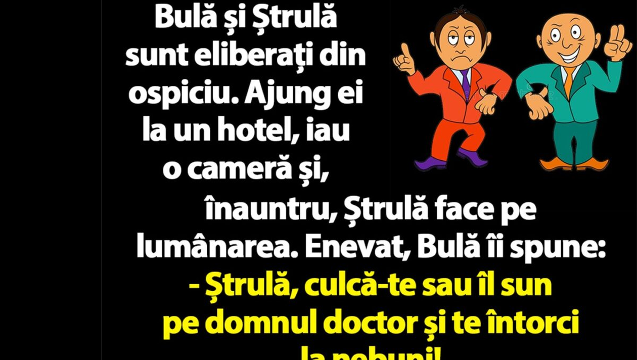 Dragă cititorule, pentru astăzi, CANCAN.RO ți-a pregătit un banc fresh la care, cu siguranță, o să te prăpădești de râs! Bulă și Ștrulă sunt eliberați din ospiciu, iar ce a urmat este demn de cea mai haioasă comedie.
