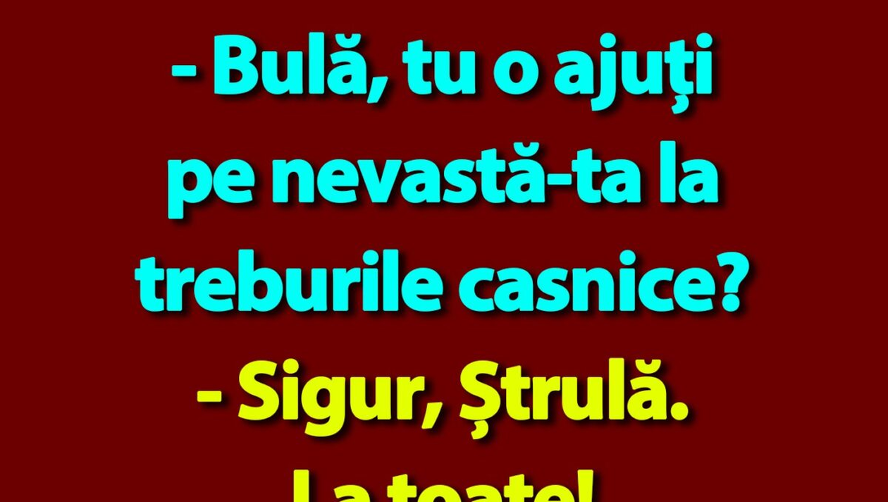 Dragi cititori, vrem să vă aducem zâmbetul pe buze așa că vă punem la dispoziție un banc amuzant. Știm cât de mult vă plac glumele cu Bulă și Ștrulă, iar în acest caz vă prezentăm o discuție hilară între cei doi amici. Soțul Bubulinei, băiat de casă sau nu? Răspunsul te va face să râzi cu lacrimi!