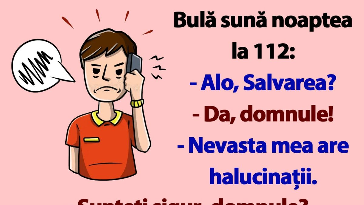 Banc. Este dimineață, moment în care ar fi ideal să vă începeți ziua cu zâmbetul pe buze. De data aceasta, în centrul atenției se află celebrul Bulă, un personaj îndrăgit încă din perioada comunismului. Bulă apelează numărul de urgență 112 și susține că soția lui are halucinații. Dialogul stârnește amuzamentul, așa că spor la râs!