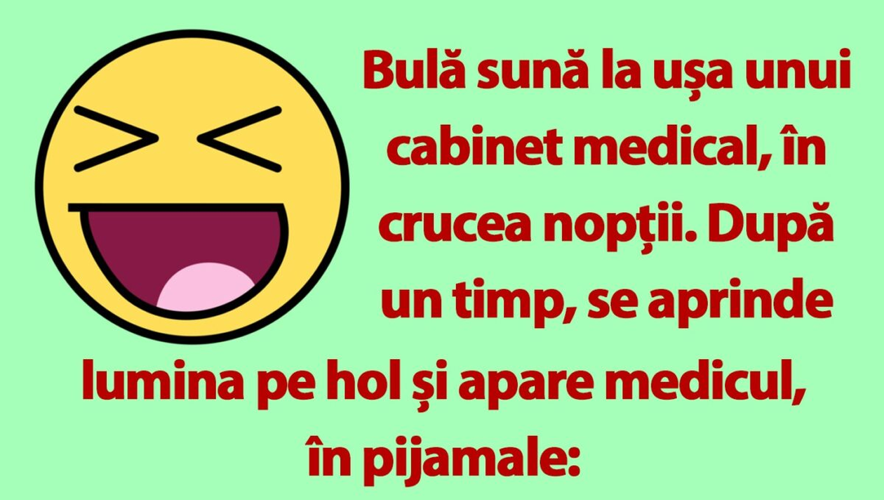 Dragi cititori, CANCAN.RO vă prezintă un banc de nota 10 cu care să începeți ziua de duminică. Protagonistul este nimeni altul decât Bulă, personajul de satiră preferat al românilor. Acesta ajunge la medic pentru a rezolva o problemă serioasă. Spor la citit și voie bună!
