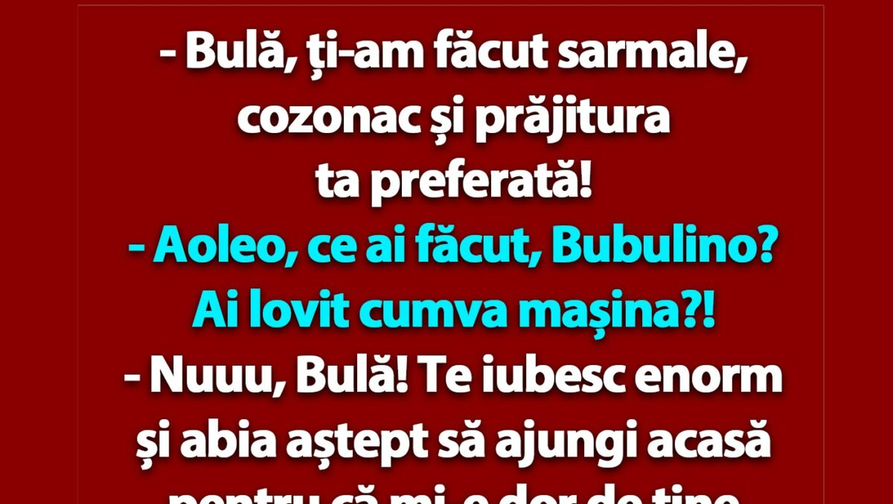 Dragi cititori, CANCAN.RO v-a pregătit un banc amuzant care-ți va aduce zâmbetul pe buze chiar în dimineața de Paște. Pentru a începe ziua bine, atunci trebuie neapărat să auzi un banc cu Bulă și Bubulina.