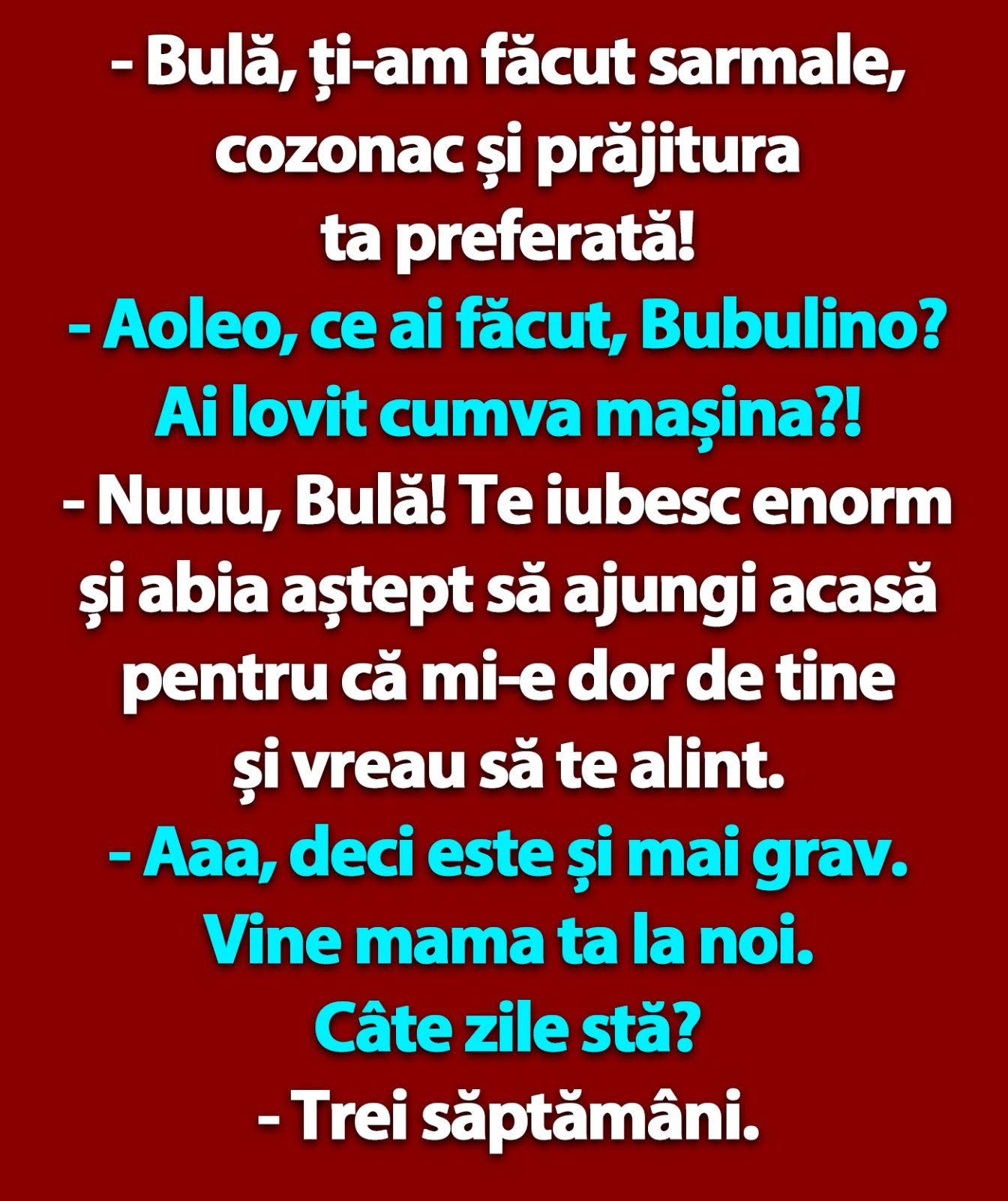 – Nuuu, Bulă! Te iubesc enorm și abia aștept să ajungi acasă pentru că mi-e dor de tine și vreau să te alint.