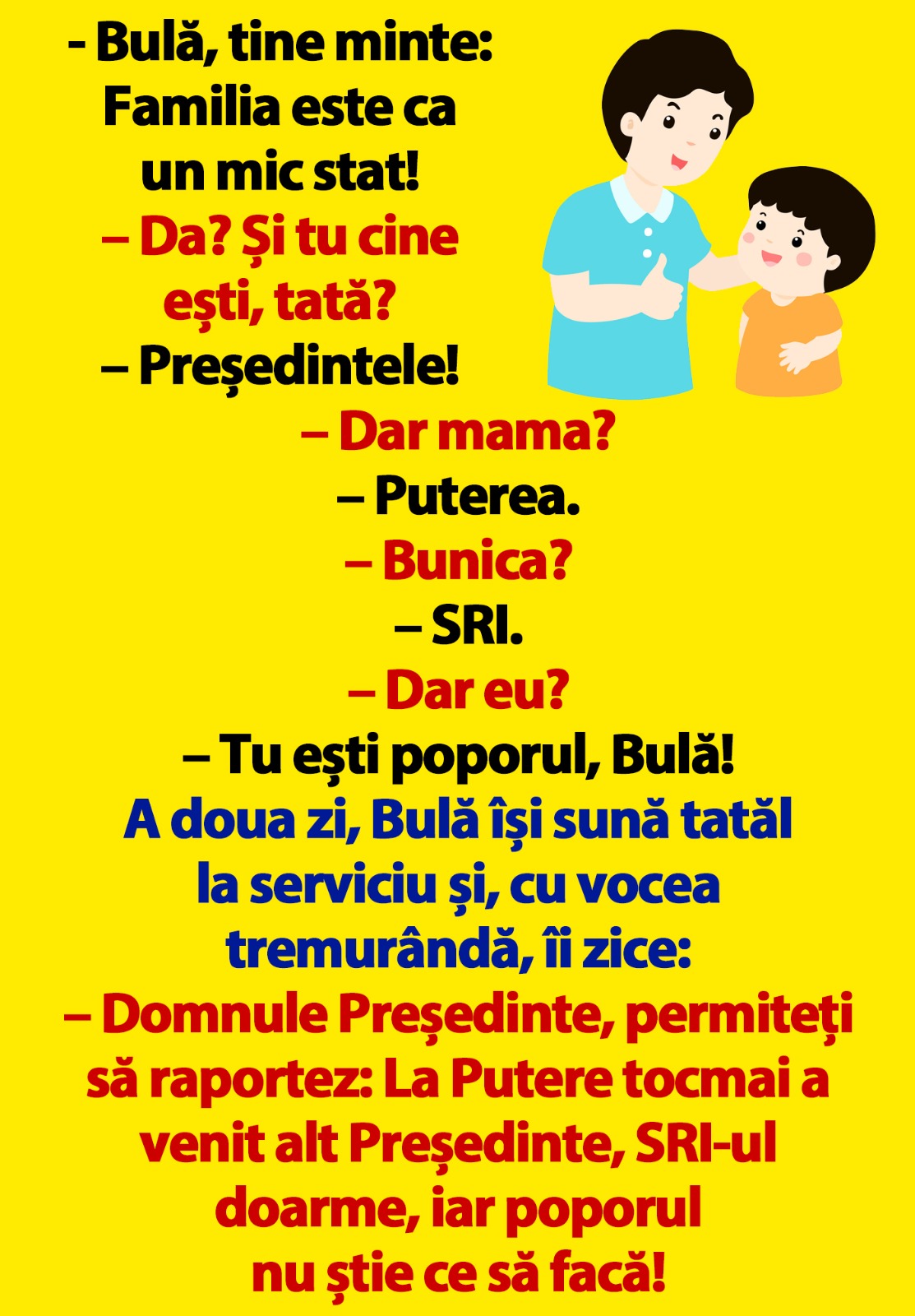 – Domnule Președinte, permiteți să raportez: La Putere tocmai a venit alt Președinte, SRI-ul doarme, iar poporul nu știe ce să facă!”