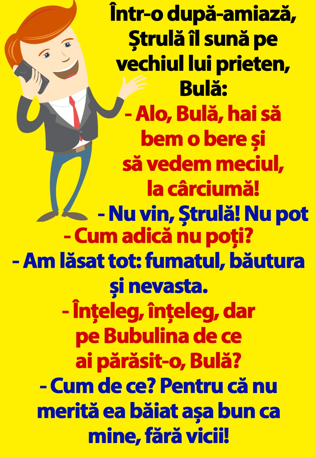 – Alo, Bulă, hai să bem o bere și să vedem meciul, la cârciumă!
