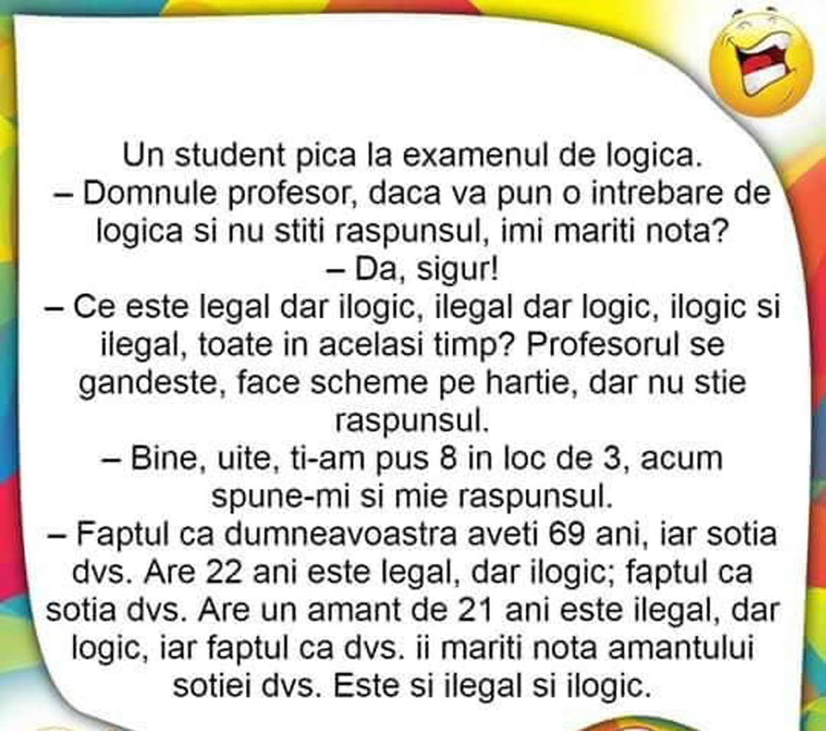 – Domnule profesor, dacă vă pun o întrebare logică și nu știți răspunsul, îmi măriți nota?