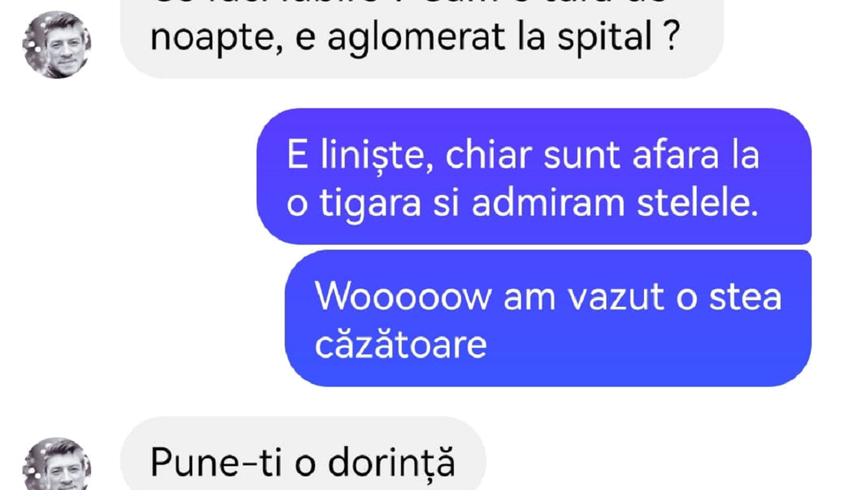 Banc. Un bărbat și partenera lui stau de vorbă, pe Messenger. El o întreabă pe iubita lui dacă e aglomerată tura de noapte la spital, iar ea îi răspunde că nu, însă a sesizat o stea căzătoare. Continuarea dialogului stârnește amuzamentul. Spor la râs, dragi cititori!