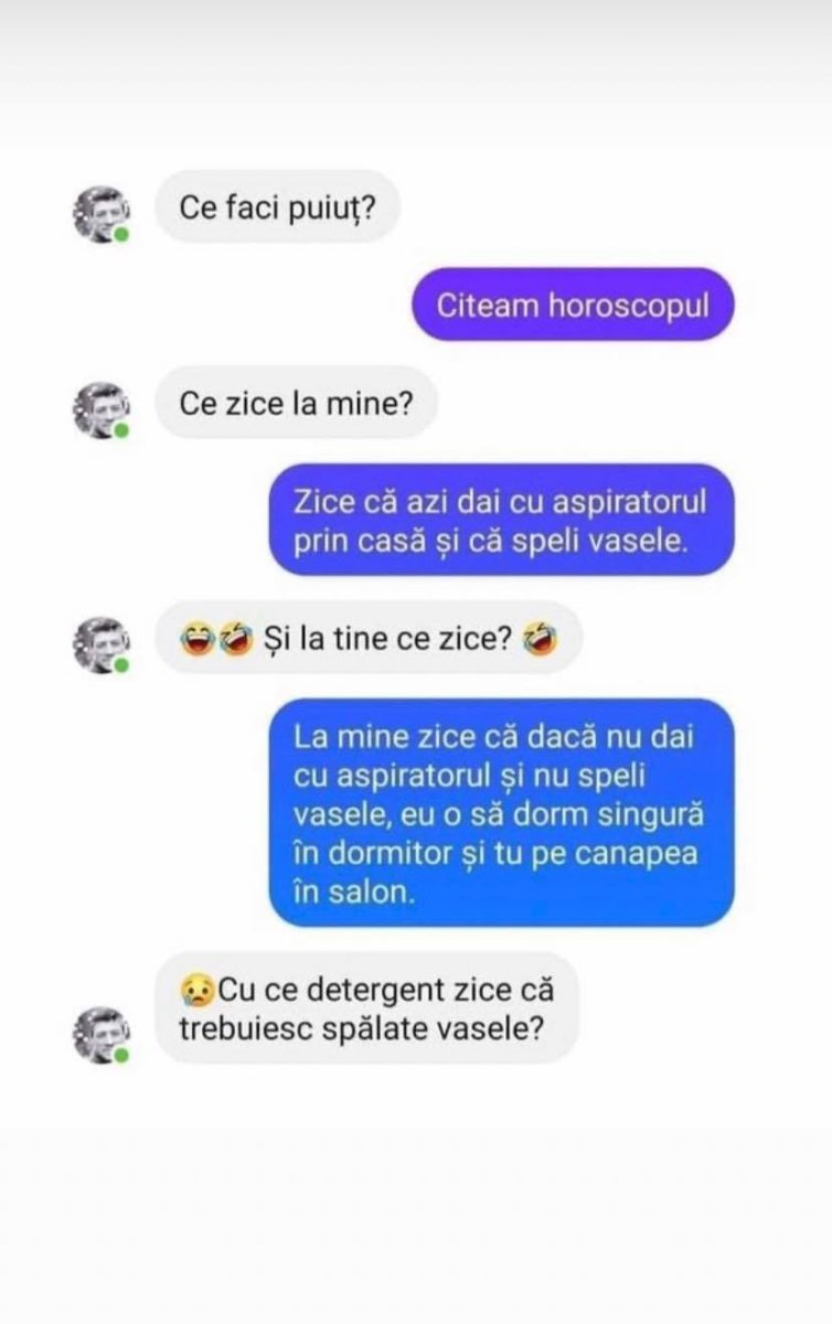 – La mine zice că dacă nu dai cu aspiratorul și nu speli vasele, eu o să dorm singură în dormitor și tu pe canapea în salon.