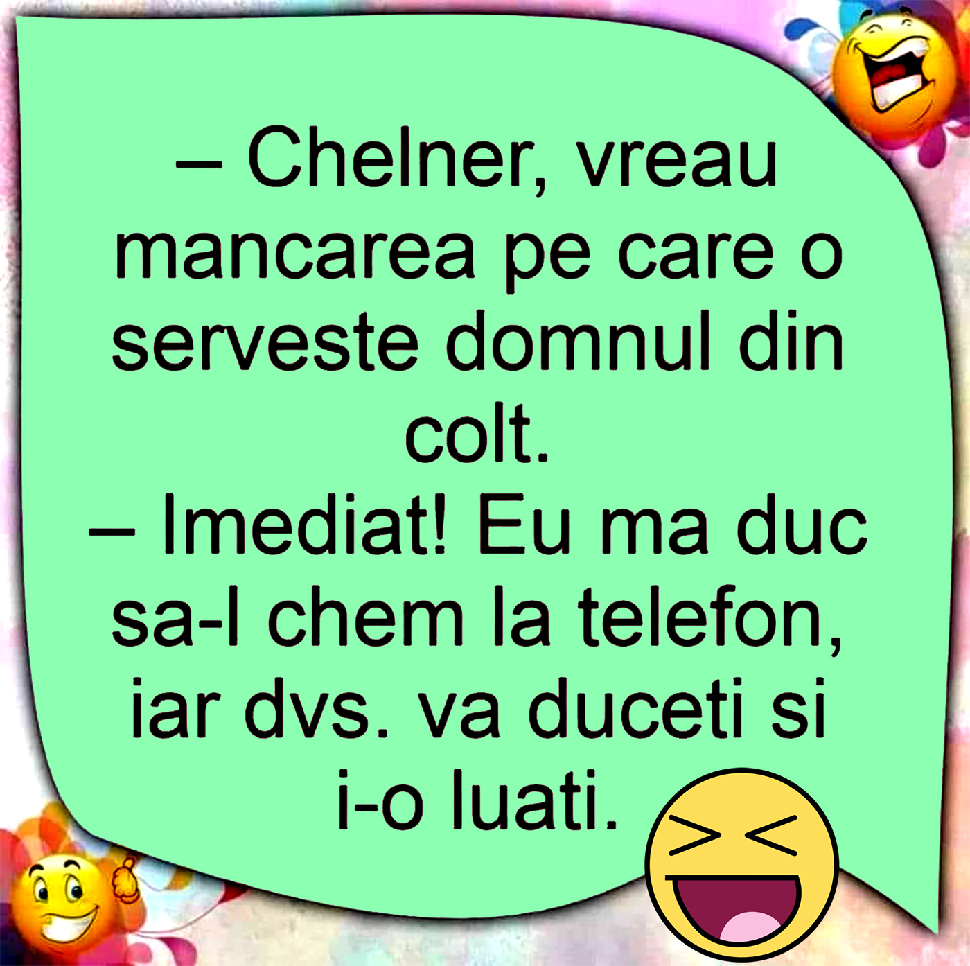 Pentru că este o zi ploiasă și mohorâtă, echipa CANCAN.ro s-a gândit să o însenineze puțin cu un banc de calitate. Azi avem pentru voi un banc delicios, care are loc într-un restaurant cu mâncare savuroasă. Dar nu vă mai ținem mult în susăans, ci vă lăsăm să aflați din rândurile care urmează ce îi cere un client ospătarului său.