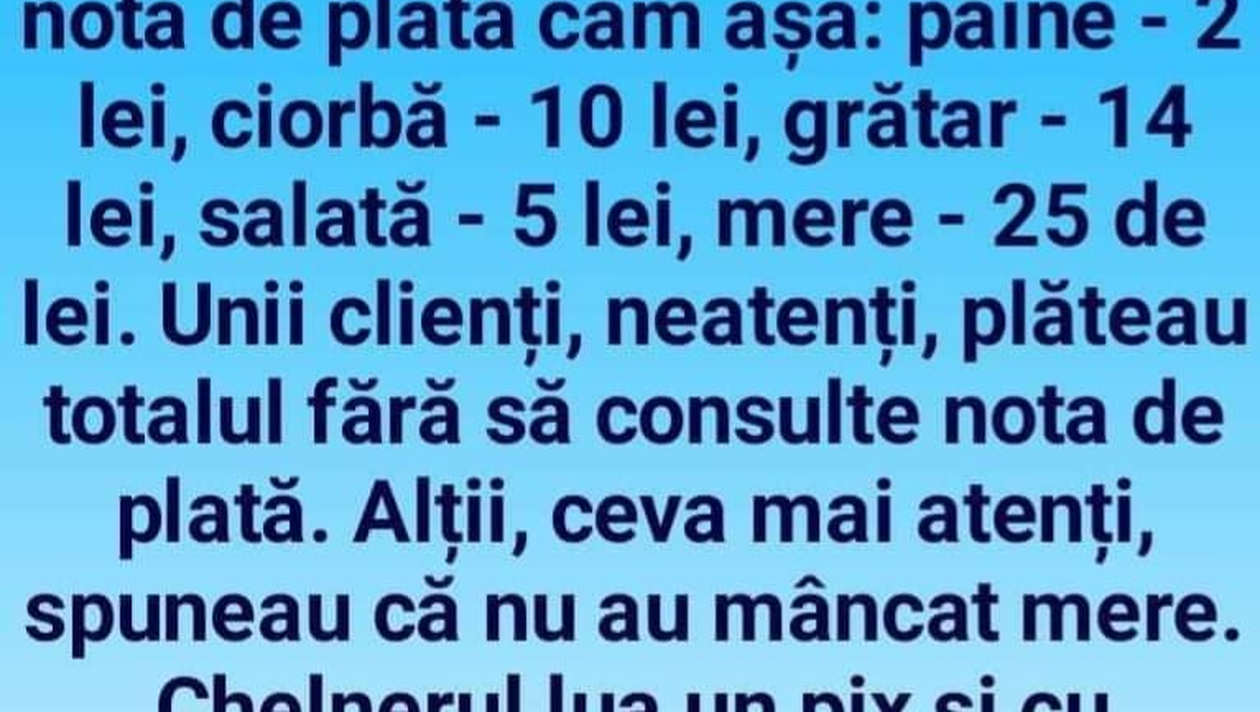 Ziua nu trebuie să treacă fără o porție copioasă de râs, iar pentru asta am pregătit un banc care cu siguranță te va amuza copios. Protagonistul de astăzi este un chelner ardelean, care profită de clienții pe care îi are și încarcă nota de plată. Deznodământul este hilar.