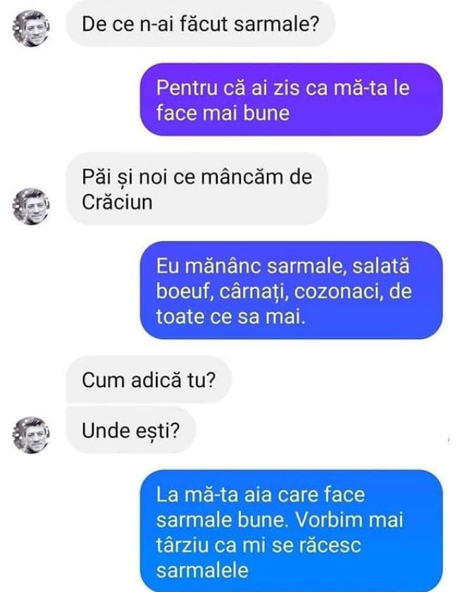 – La mă-ta aia care face sarmale bune. Vorbim mai târziu, că mi se răcesc sarmalele.