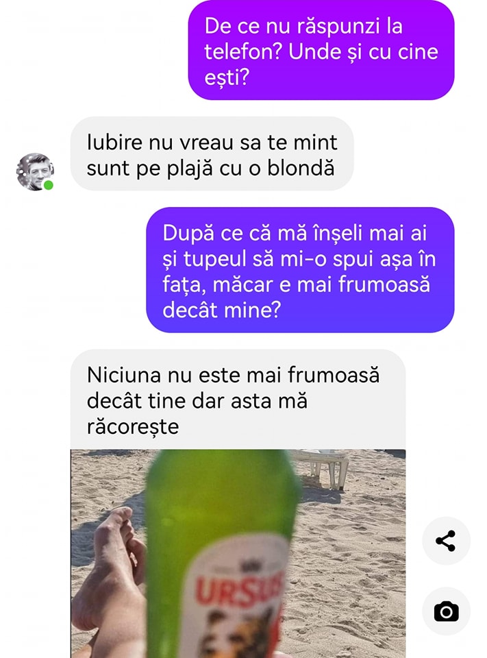 – După ce că mă înșeli, mai ai și tupeul să mi-o spui așa în față, măcar e mai frumoasă decât mine?