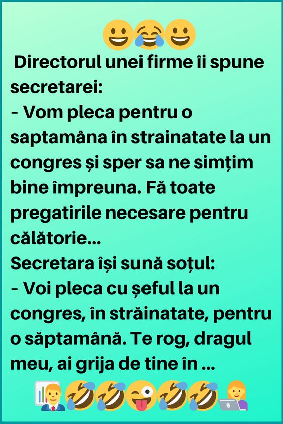 – Voi pleca cu șeful la un congres, în străinatate, pentru o săptamână. Te rog, dragul meu, ai grija de tine în acest timp.