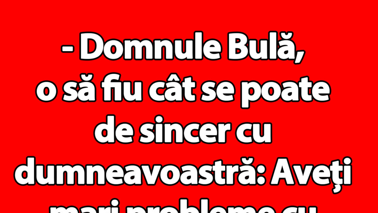 Este a doua zi de weekend și distracția trebuie să fie și ea în programul de azi! Motiv pentru care echipa CANCAN.ro vă aduce un nou banc savuros cu celebrul Bulă, personajul fictiv de glume și anecdote al poporului român. De data aceasta, Bulă merge la doctor și ne va pune iar un zâmbet larg pe buze!