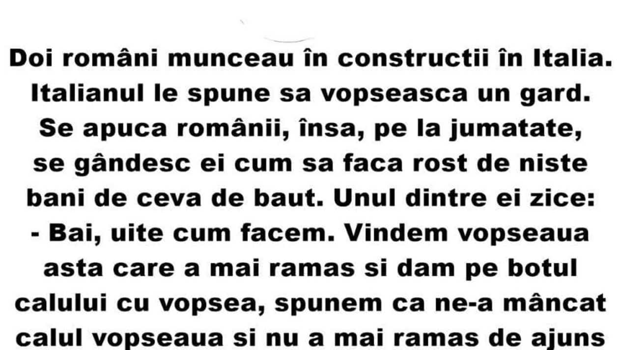 Zis și făcut. Își luară românii băutura, mâncare, țigări, vine seara italianul acasă. Vede gardul neterminat și îl întreabă ce s-a întâmplat. Ăștia îi explică cum calul le-a mâncat vopseaua și nu au mai avut ce face. Italianul, nervos, ia pușca, iese afară și împușcă calul. Românii, înmărmuriți de uimire, îl întreabă:
