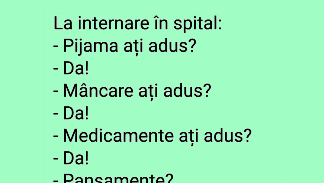 Banc. Un pacient și un angajat al unui spital poartă un dialog. Este întrebat dacă și-a adus, de acasă, pijamale, mâncare, medicamente și pansamente. Apoi, îl observă pe un bărbat care îl însoțea pe pacient. Conversația stârnește amuzamentul! Spor la râs!