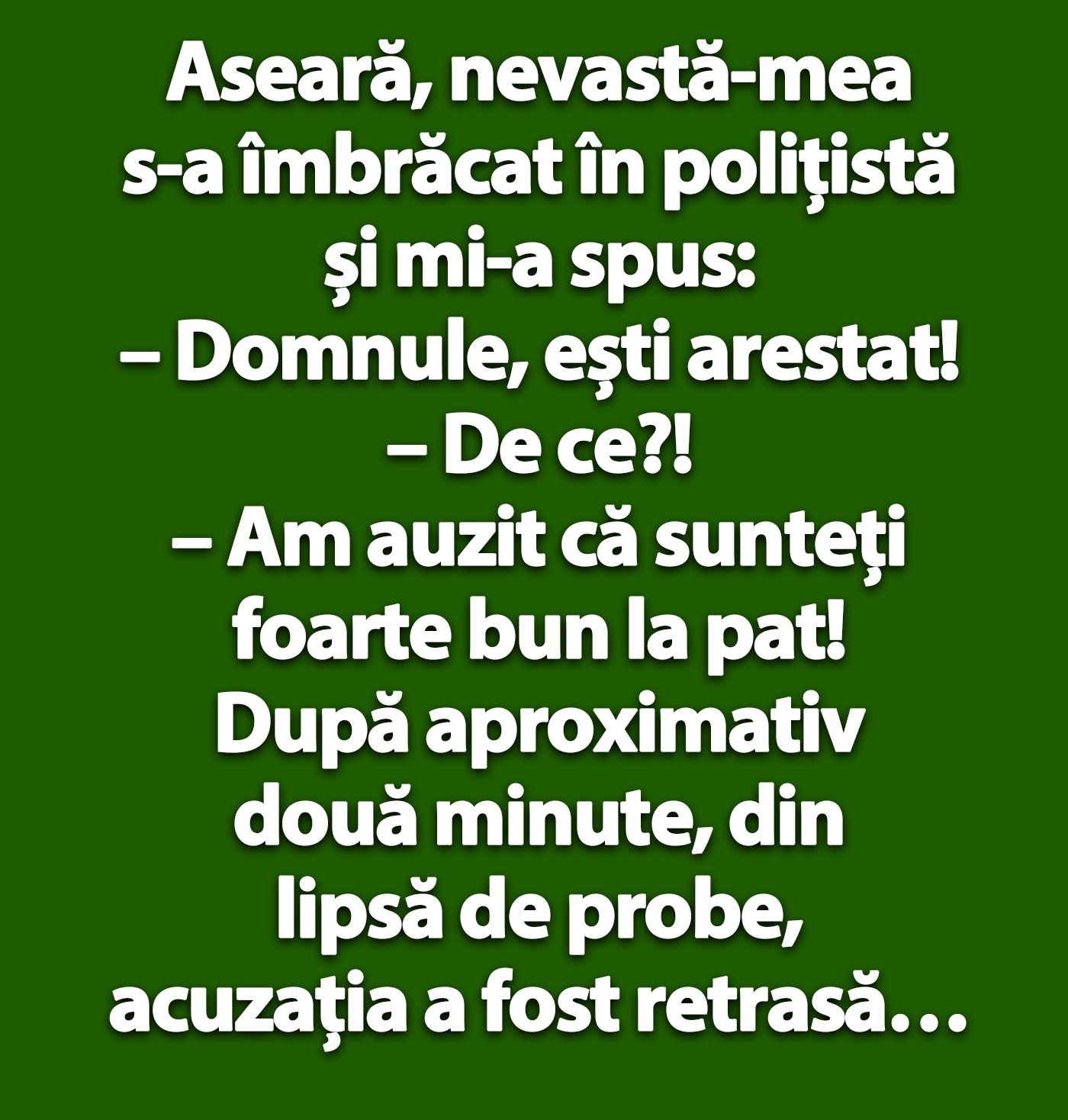 Banc. Este miercuri, motiv pentru care este momentul să aveți zâmbetul pe buze, precum în oricare zi a săptămânii. De data aceasta, vă prezentăm un banc savuros cu o soție care a vrut să își surprindă partenerul de viață. Pentru o noapte „fierbinte”, s-a deghizat în polițistă și i-a spus soțului că îl „arestează”. Bancul vă va stârni amuzamentul! Spor la râs, dragi cititori!