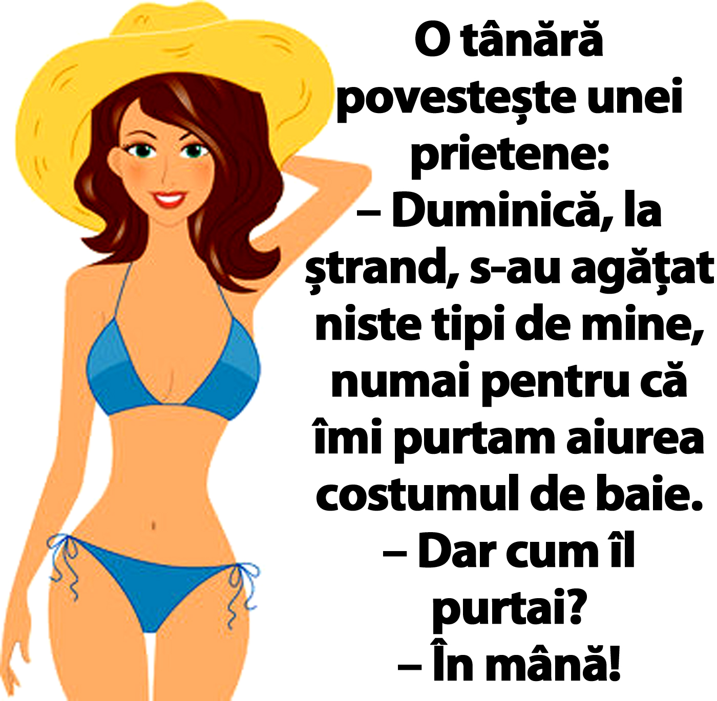 – Duminică, la ștrand, s-au agățat niste tipi de mine, numai pentru că îmi purtam aiurea costumul de baie.